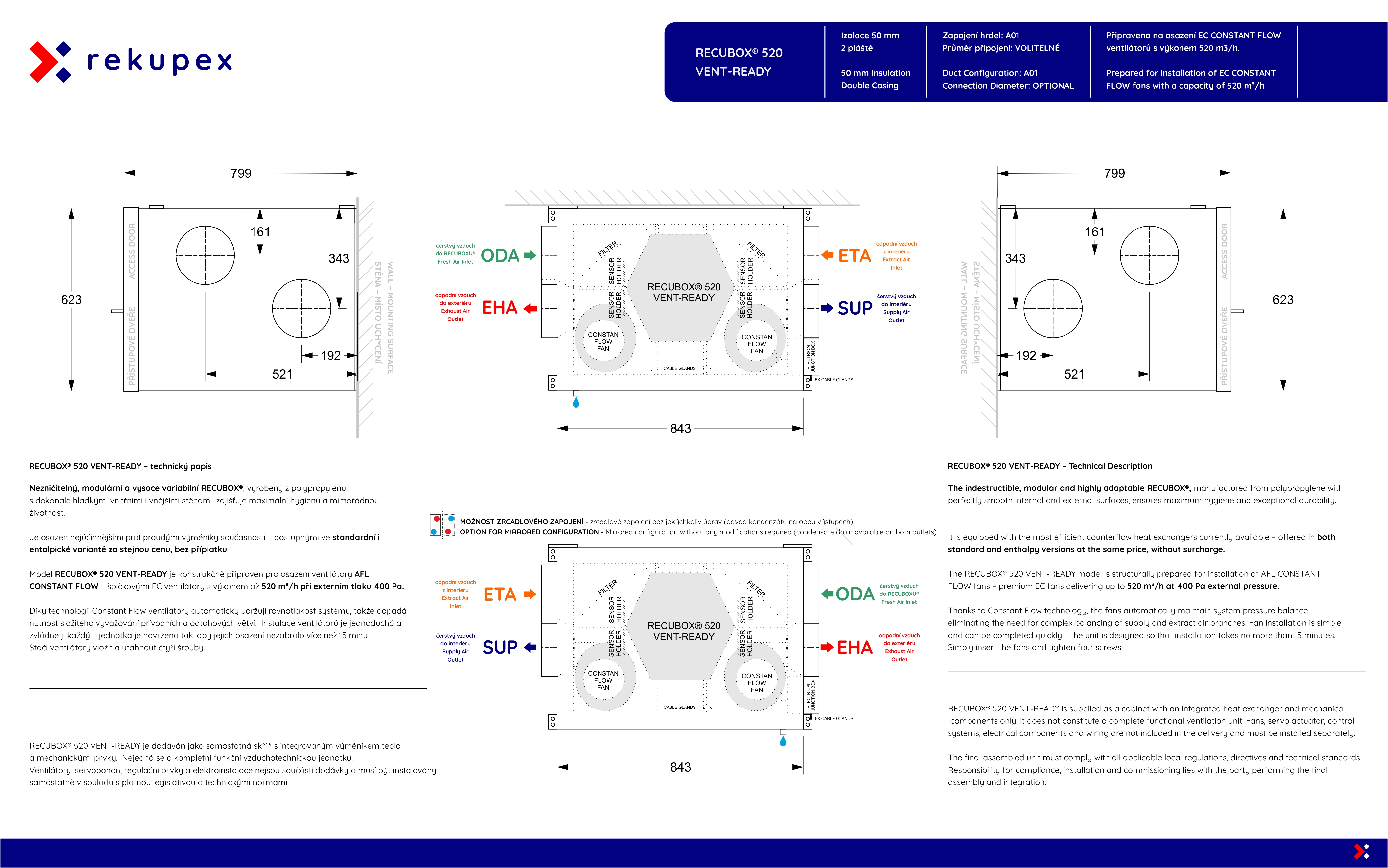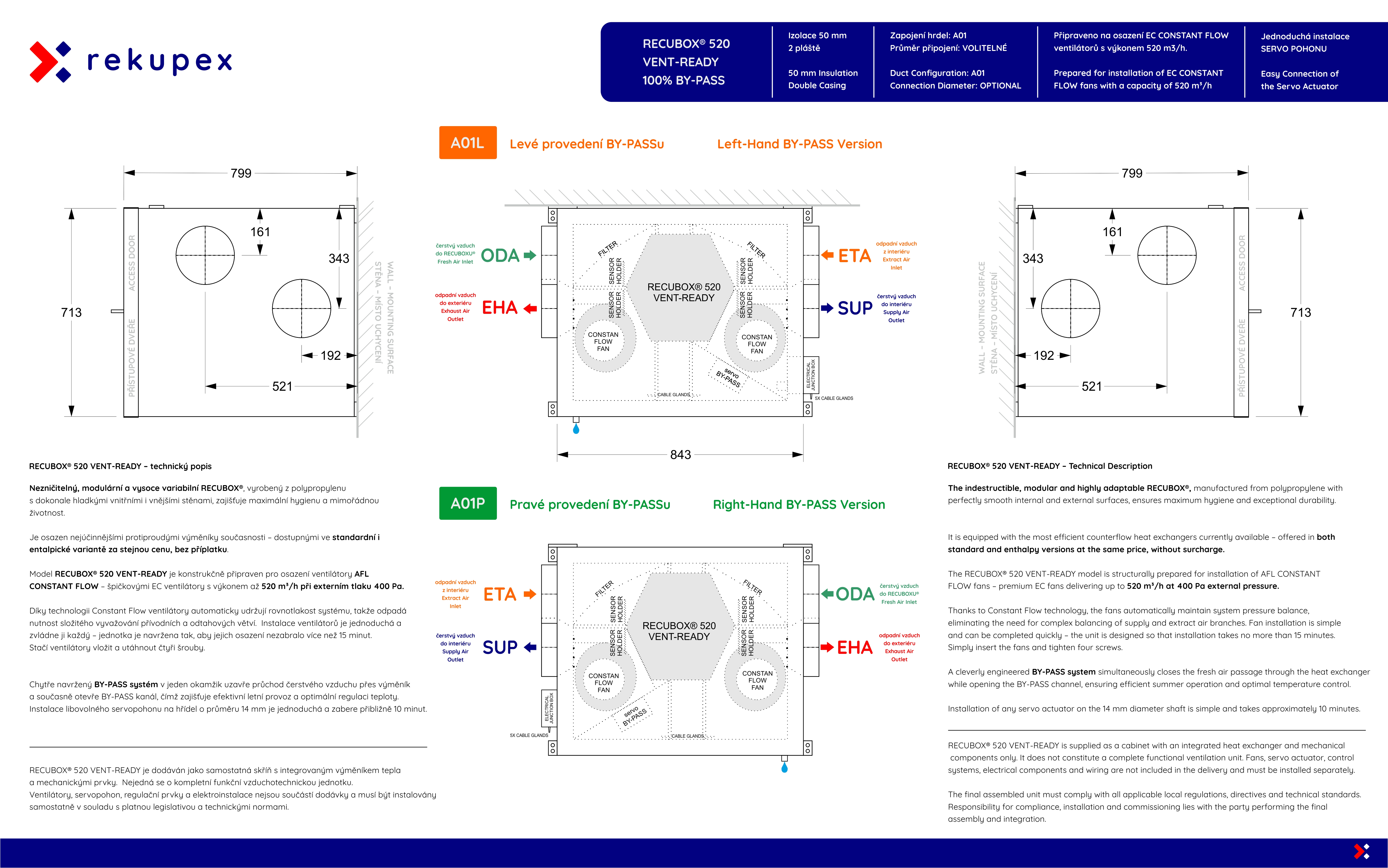 RECUBOX® HRV 520 VENT-READY je kompaktní rekuperační jednotka připravená pro osazení EC ventilátory AFL CONSTANT FLOW. Představuje mimořádně odolný, hygienický a variabilní základ pro moderní rovnotlakou rekuperaci vzduchu v rodinných domech, bytech i menších komerčních objektech.