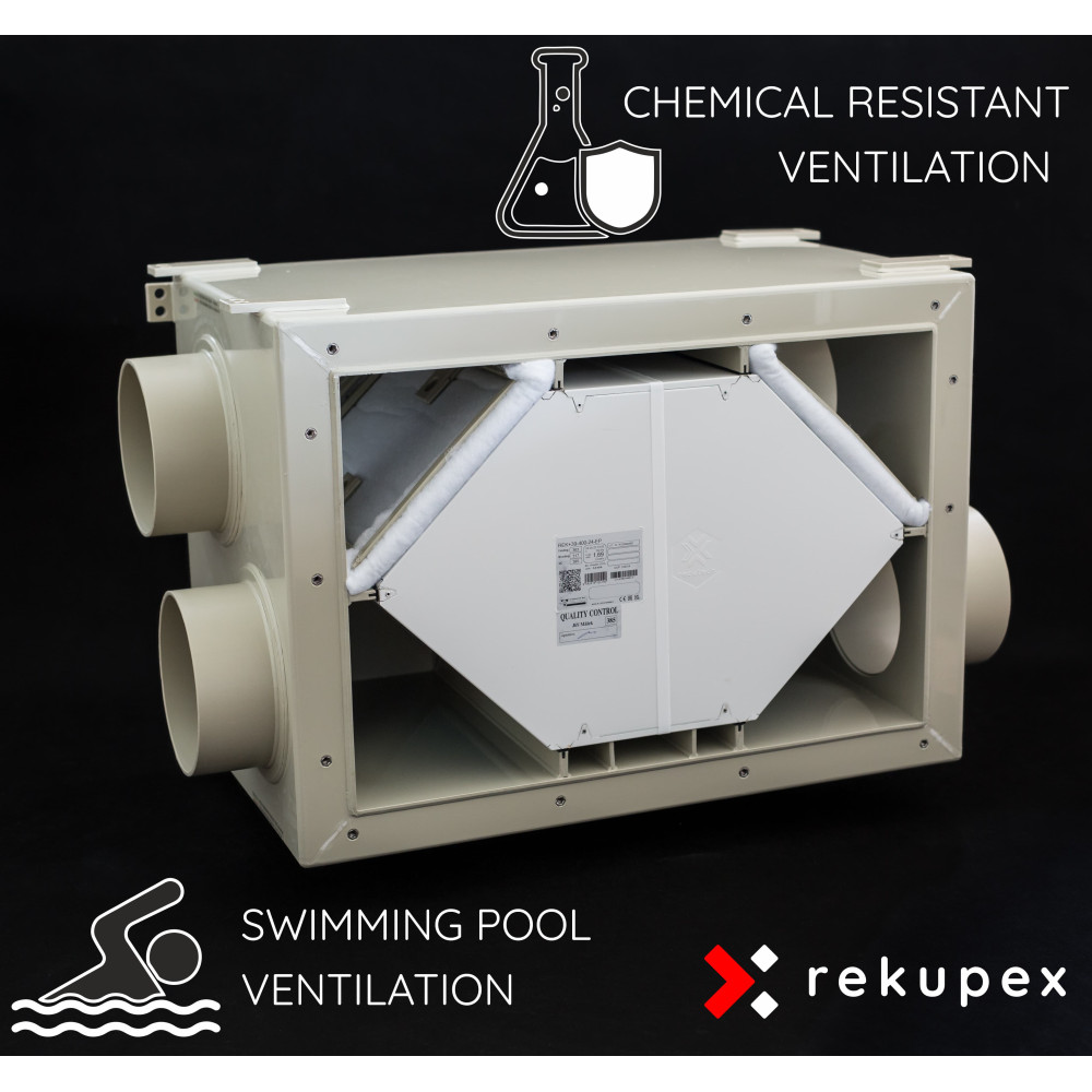 RECUBOX® X-POOL ir augstākās klases ķīmiski izturīga gaisa atgūšanas iekārta, kas paredzēta visaptverošai gaisa atgūšanai peldbaseinos , labsajūtas centros, saunās, laboratorijās un rūpnieciskās telpās ar viegli agresīvām ķīmiskām vielām.